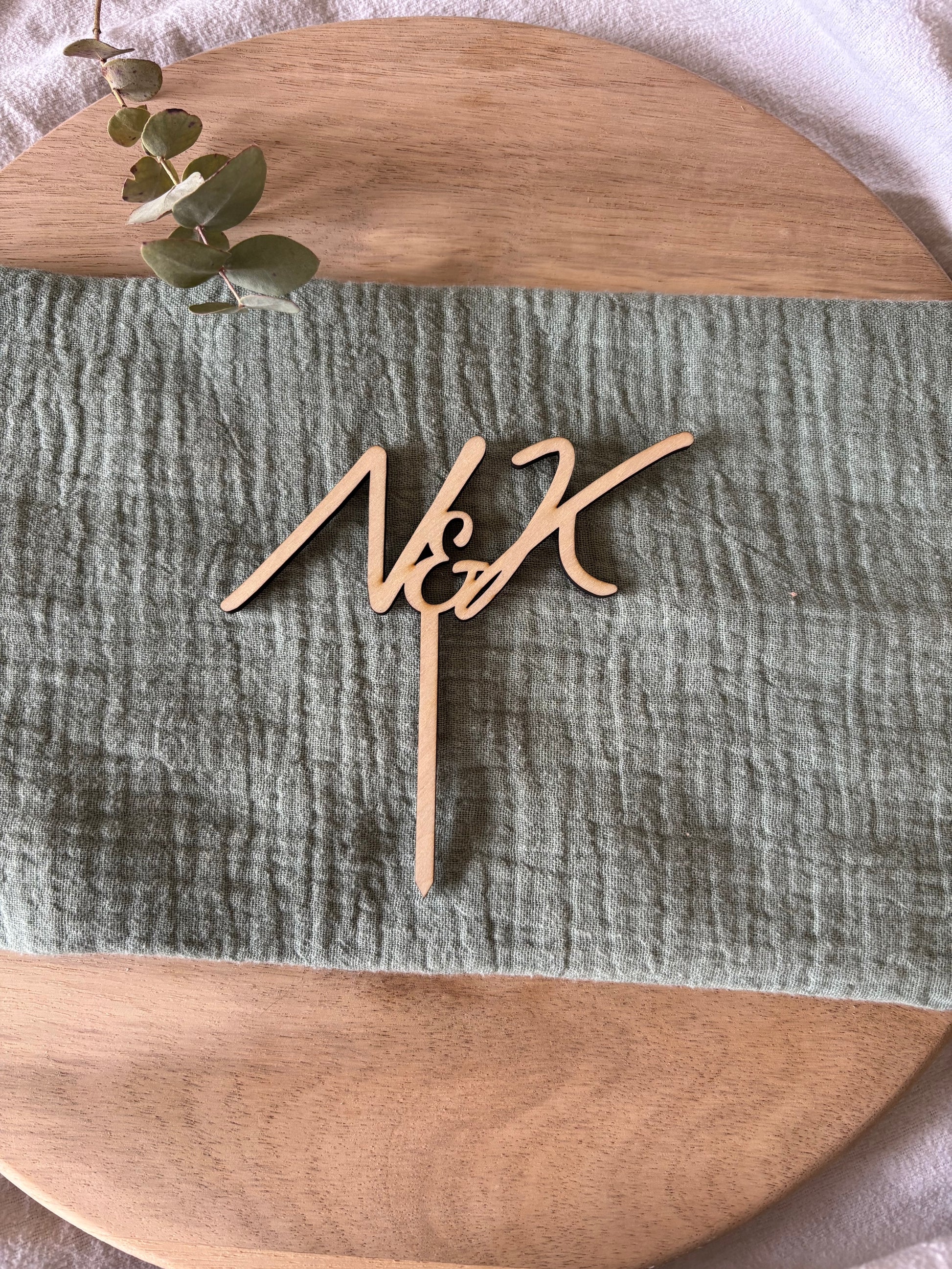 Ein stilvoller Cake Topper aus Holz, der die Initialen des Brautpaares durch ein zartes „&“ verbindet – ein elegantes Highlight für eure Hochzeitstorte.